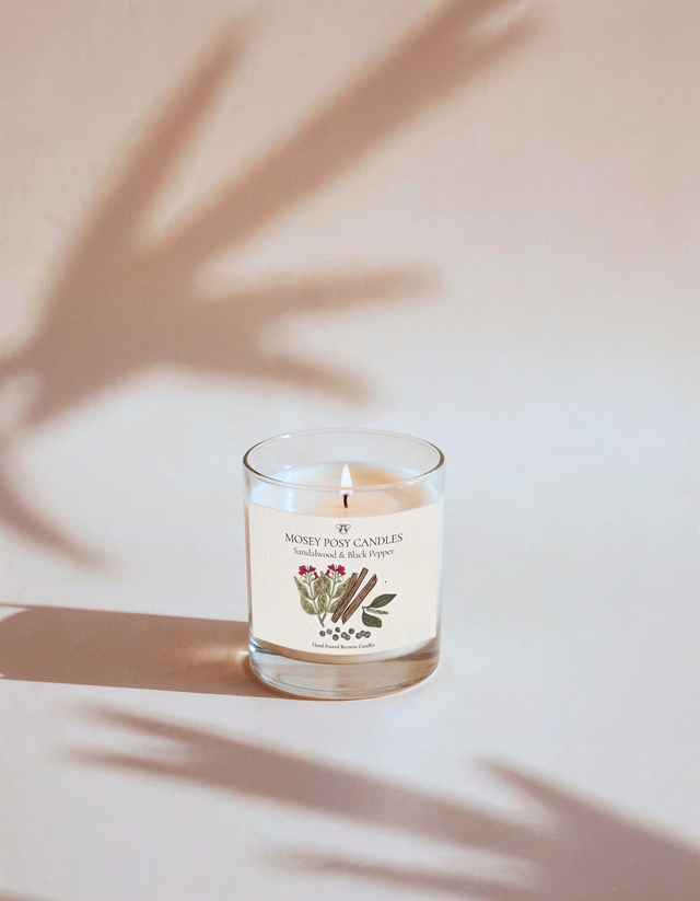 9cl hand poured scented beeswax glass container candle. Average burn time of a beeswax 9cl candle is between 20-25 hours.